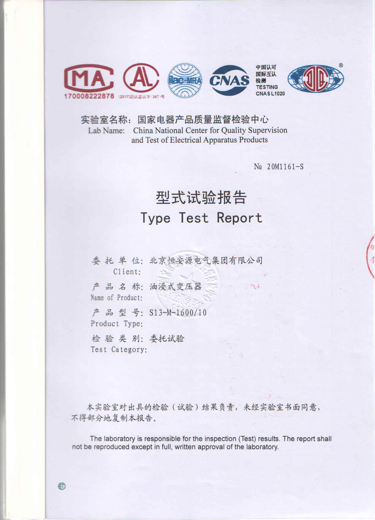 经过一系列的相关试验后,苏高所于2020年07月10日对送检产品作出以下检验结论:油浸式变压器(型号:S13-M-1600/10)例行试验、型式试验、压力变形试验、三相变压器零序阻抗测量、空载电流谐波测量和短路承受能力试验的试验结果符合检验依据标准和委托书要求,样品上述试验合格,并出具相关型式试验报告认定(编号:20M1161-S),查询真伪网址:,检验报告编号:20M1161-S,委托企业名称: